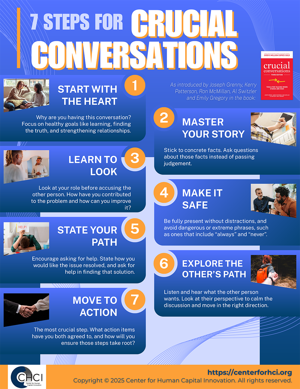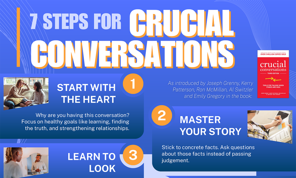 A dynamic infographic summarizing seven proven steps for handling crucial conversations, fostering understanding, emotional safety, accountability, and constructive action through clear communication and empathy.