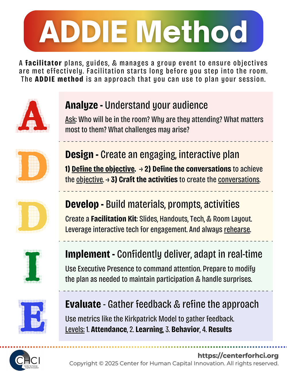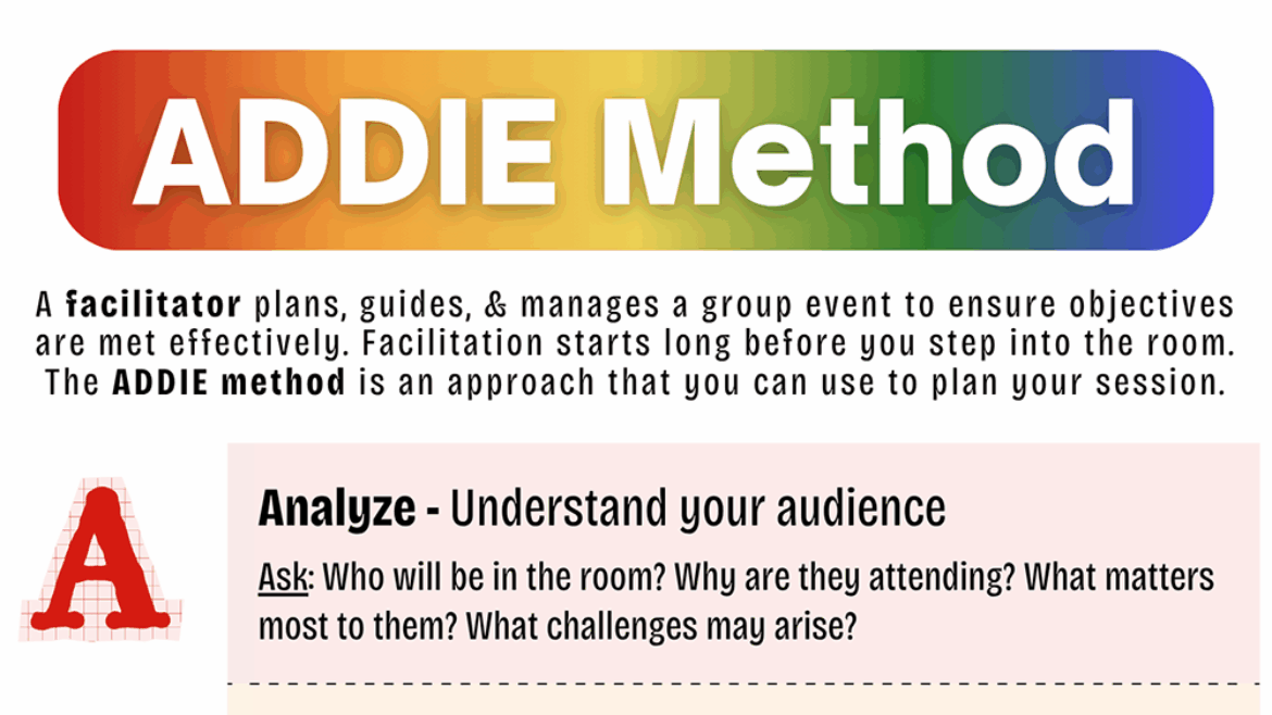 A facilitator plans, guides, & manages a group event to ensure objectives are met effectively. Facilitation starts long before you step into the room. The ADDIE method is an approach that you can use to plan your session.