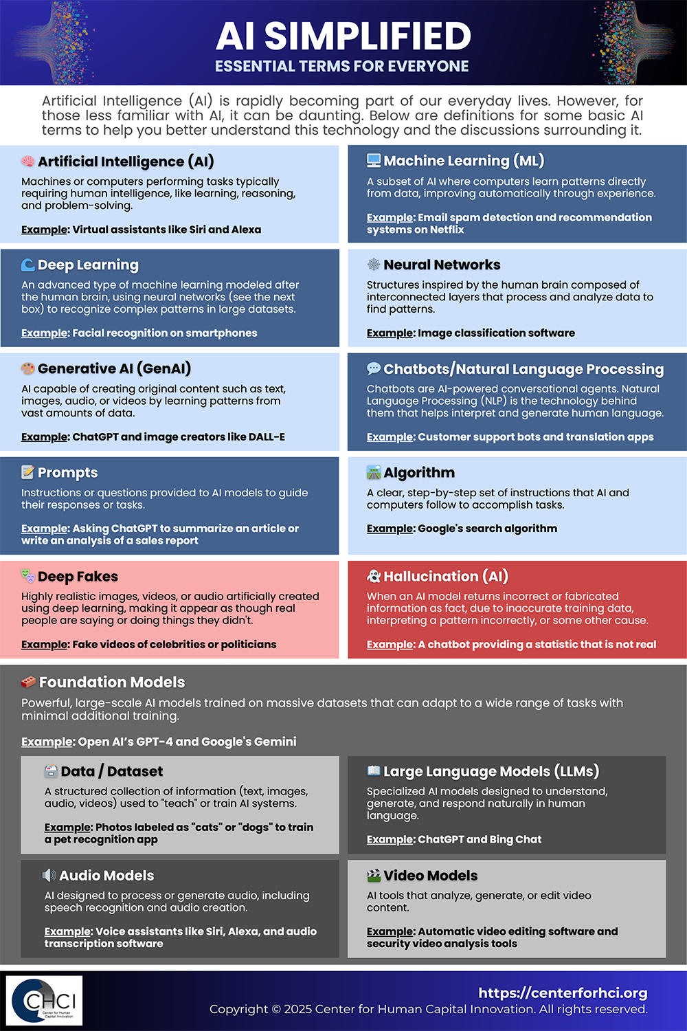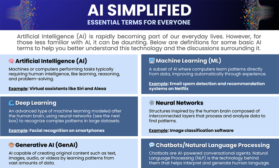 A clear, beginner-friendly infographic defining essential AI terms, concepts, and examples to help everyone better understand artificial intelligence, its applications, and common challenges.