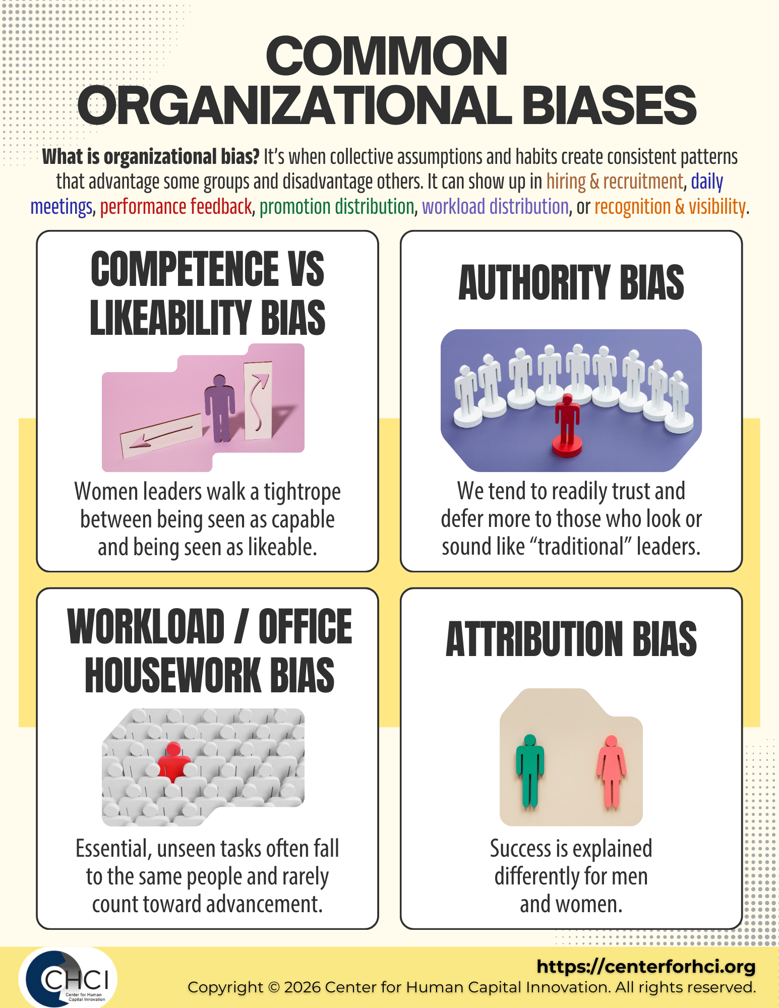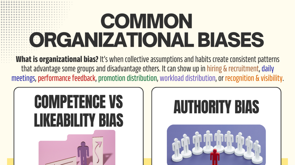 Four common workplace biases—competence vs. likeability, authority, workload/office housework, and attribution—and how they influence fairness, trust, and opportunities at work.