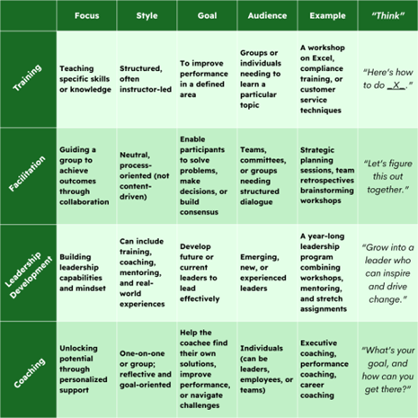 Professional development in the workplace can be overwhelming if you don’t know where to start. There are four main categories they fall under: Training, Facilitation, Leadership Development, and Coaching. Below is a guide that outlines each method to help you figure out what you are looking for and which one would be the best fit for you.