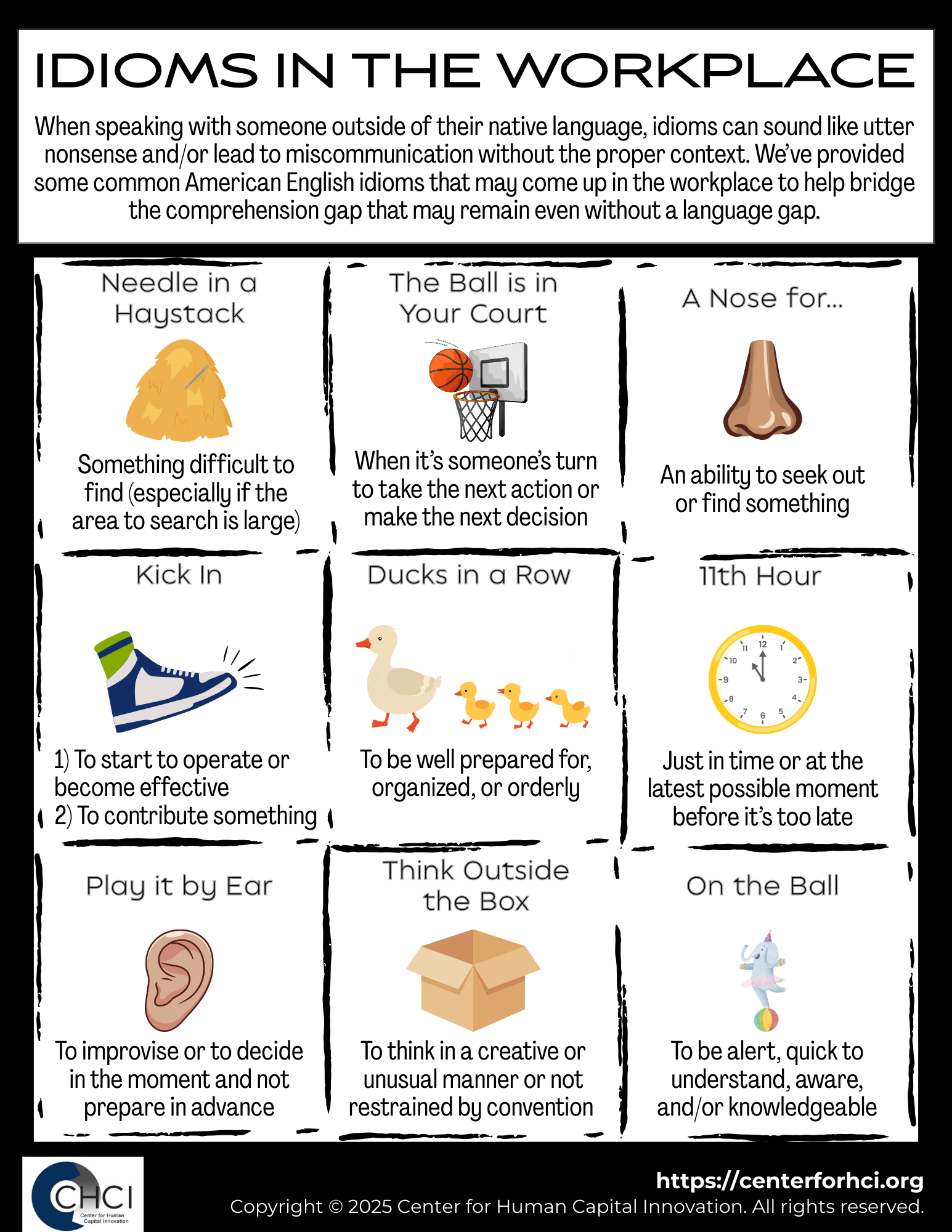 When speaking with someone outside of their native language, idioms can sound like utter nonsense and/or lead to miscommunication without the proper context. We’ve provided some common American English idioms that may come up in the workplace to help bridge the comprehension gap that may remain even without a language gap