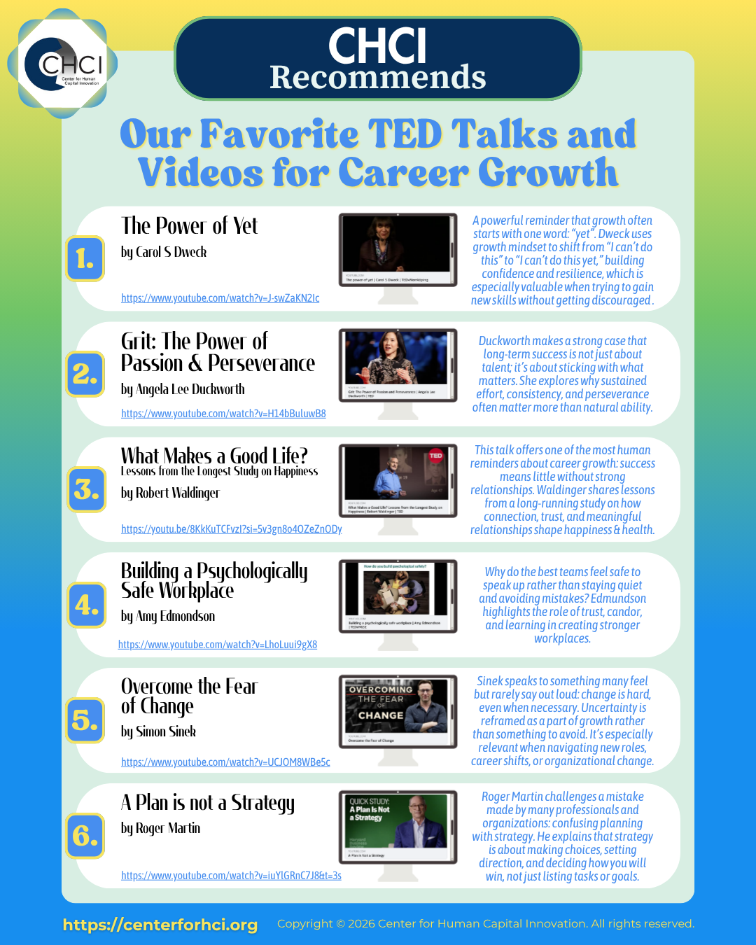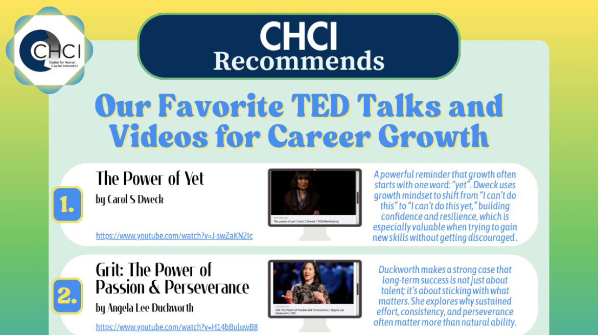 Unlock your career potential with CHCI’s handpicked TED Talks—powerful insights on mindset, leadership, resilience, and success to help you grow faster and lead better.