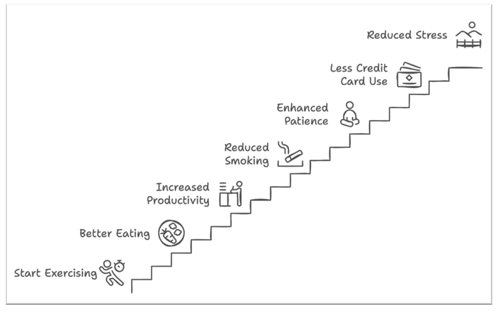 Both Clear and Duhigg describe the concept of “keystone habits,” or behaviors that trigger a cascade of positive changes across various domains. For instance, regular exercise often promotes healthier eating, better sleep, and improved productivity at work (see image below). Keystone habits are powerful due to their broad impact, catalyzing further beneficial habits and fostering overall improvement.
