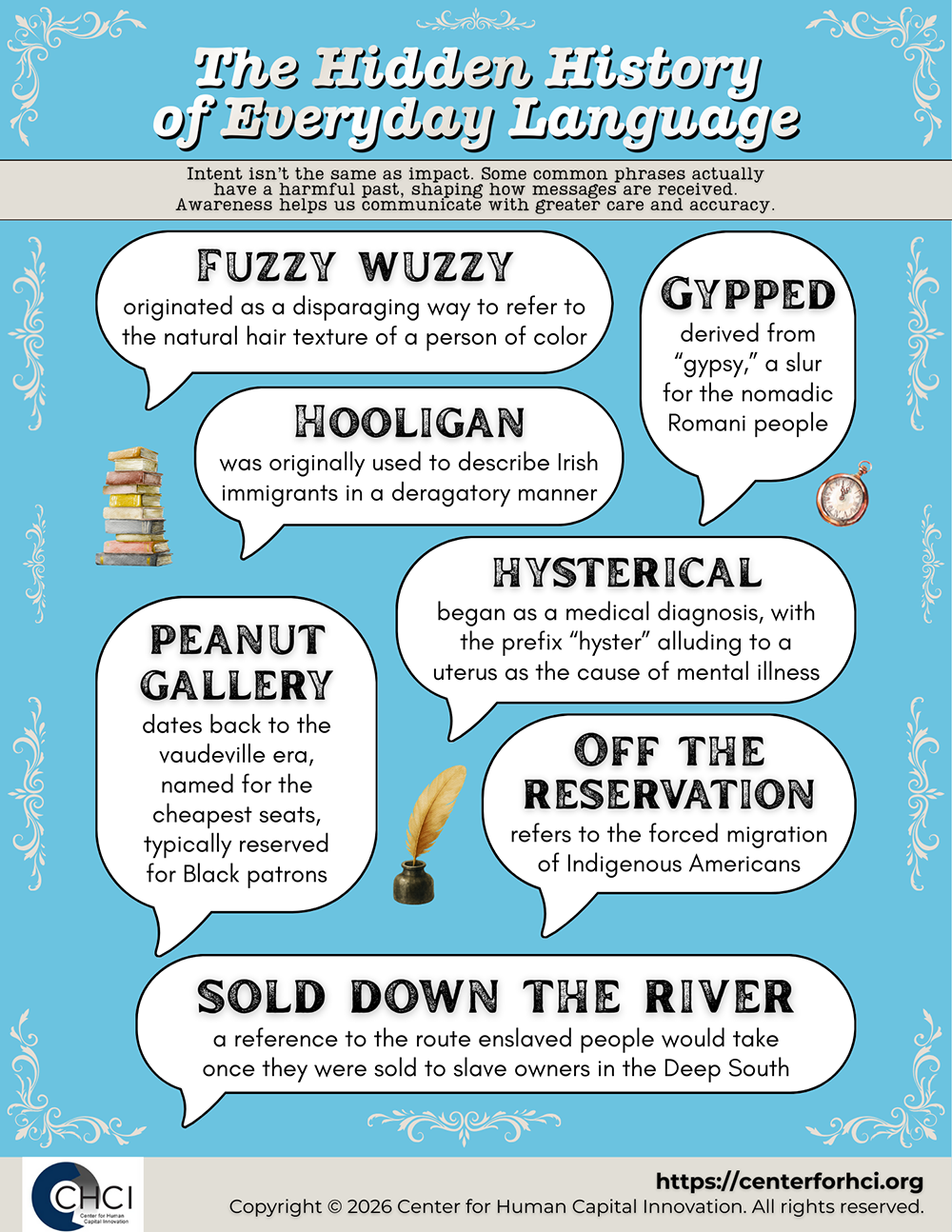 Common phrases explained with their historical roots in discrimination, showing how everyday language can carry harmful meanings and encouraging more thoughtful communication.