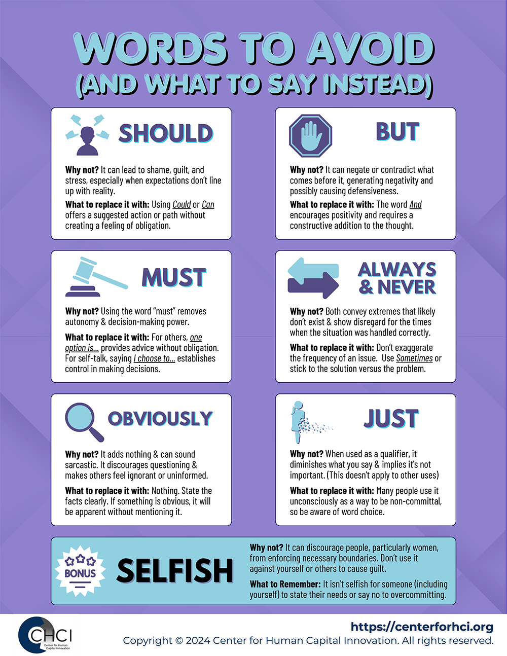 Common words and phrases that can negatively impact communication, offering alternative expressions to promote clarity and positivity.